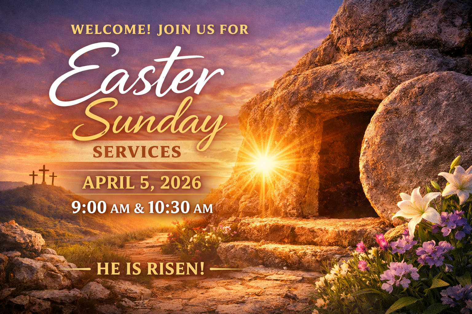 You’re warmly invited to join us for our Easter Sunday church services! Come celebrate the joy and hope of the resurrection of Jesus Christ with a welcoming community. Bring your family and friends and experience a morning filled with worship, encouragement, and the message of new life and hope that Easter brings.
